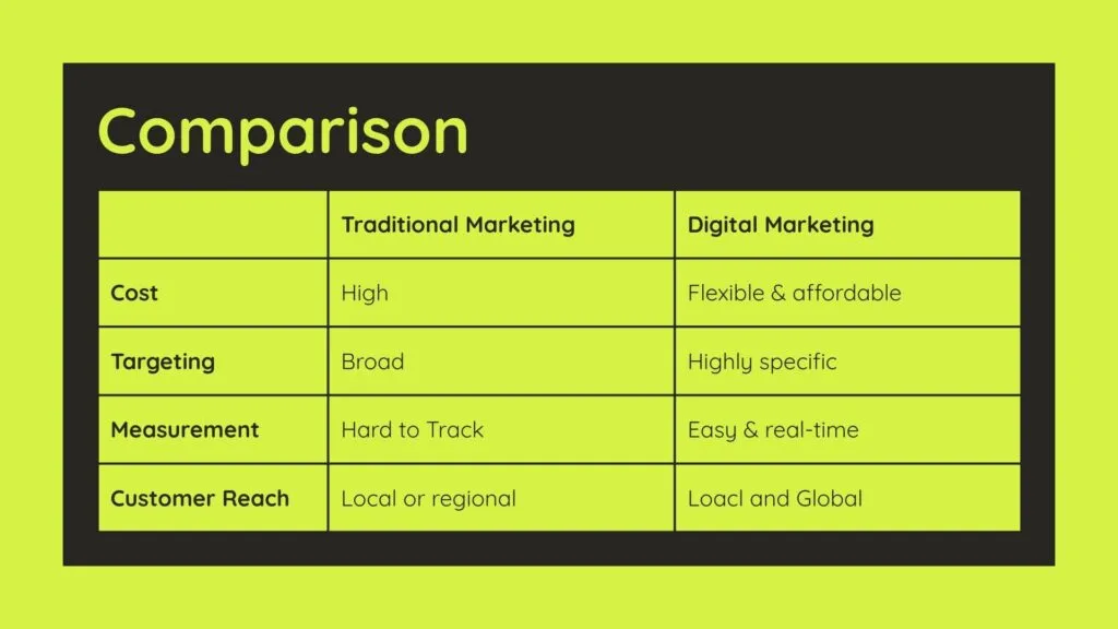 Traditional marketing is offline and broad, while digital marketing is online, targeted, and measurable.